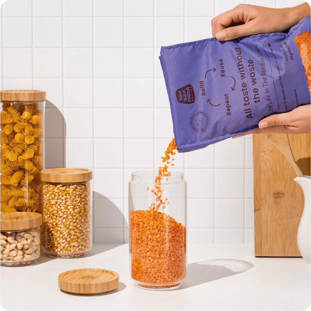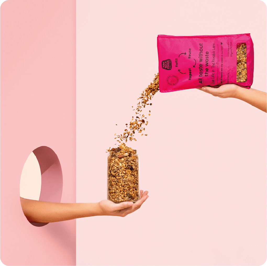 ● Reusable Plastic Waste: Our world-first packaging is made from RPET (recycled polyethylene terephthalate) plastic, which is diverted from waste streams. This material not only eliminates the need for virgin plastics but also drastically reduces CO₂ emissions. o Producing RPET emits up to 79% less CO₂ compared to new plastic. o Compared to paper-based alternatives, RPET generates over 90% less water waste during production. o Each refill bag can be reused up to 45 times, multiplying its sustainability benefits over single-use options.